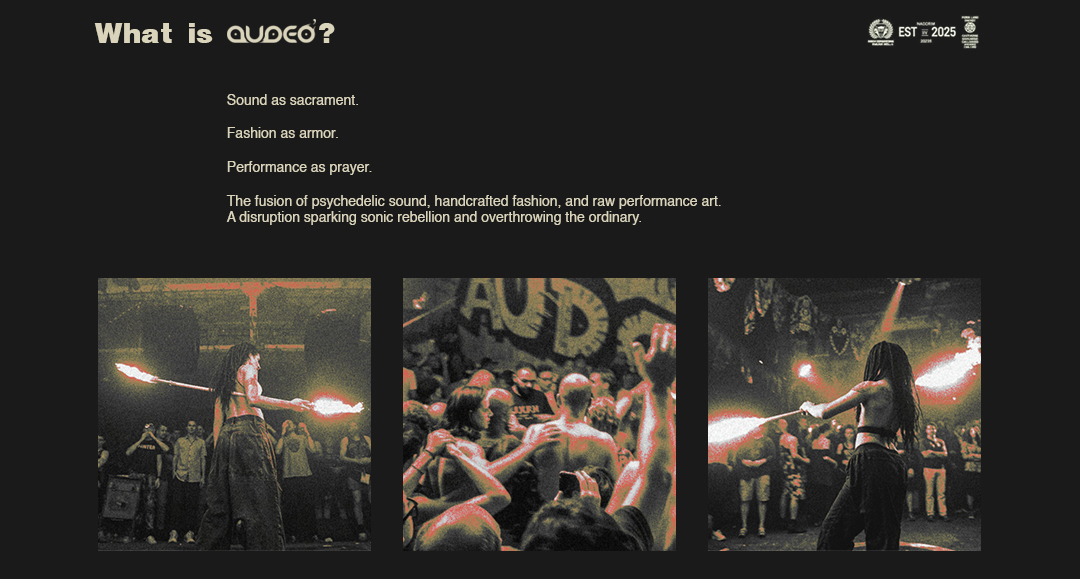 The fusion of psychedelic sound, handcrafted fashion and raw performance art. A disruption sparking sonic rebellion and overthrowing the ordinary.
