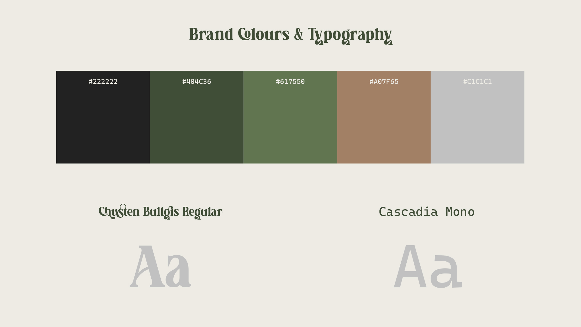To support the fluid custom wordmark, Chusten Bullgis Regular is used for headings, echoing the logo’s soft curves and expressive character. Cascadia Mono is used for body text, adding clean structure and calm readability. Together, they balance softness with clarity, reinforcing the brand’s grounded yet feminine tone.