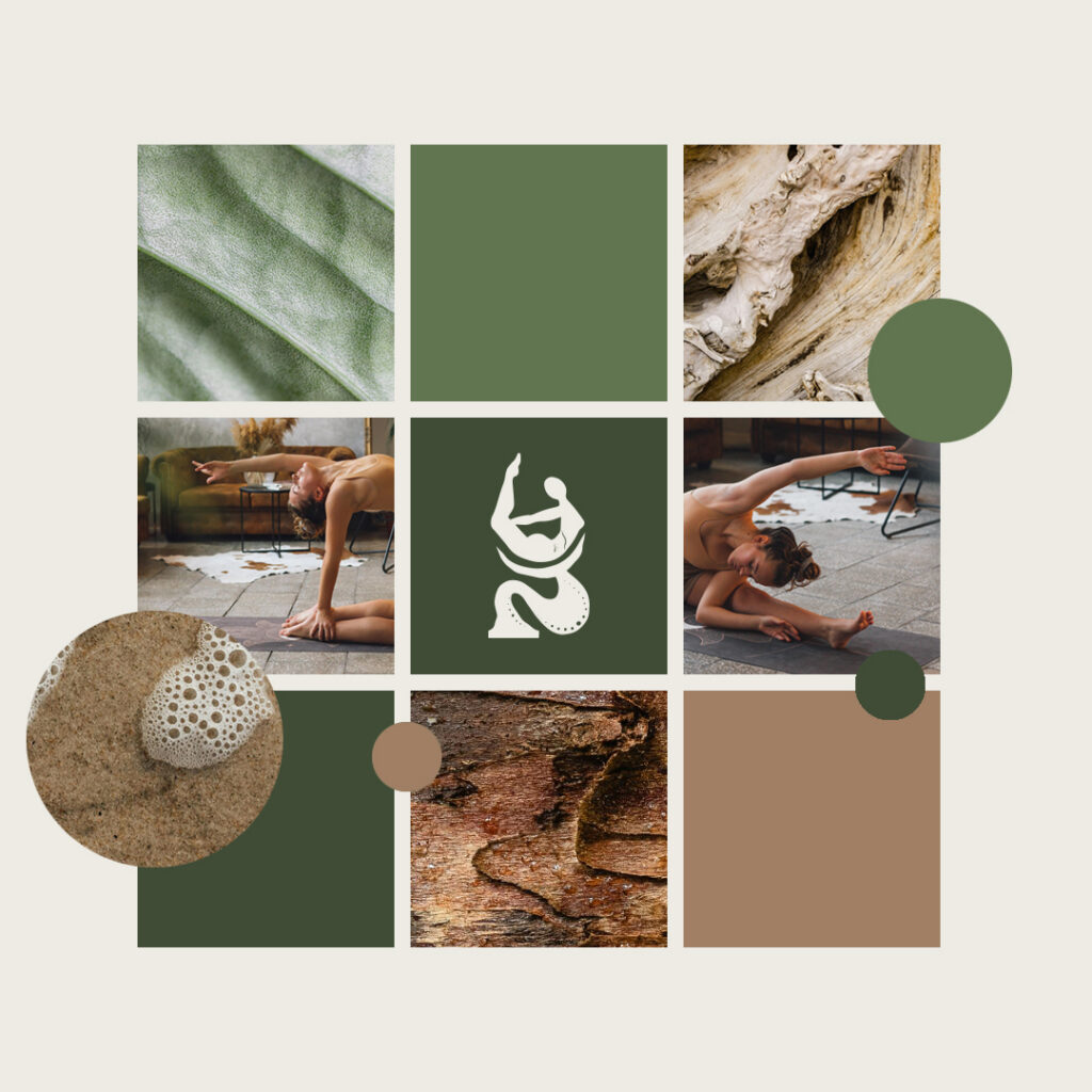 The visual identity was developed as an extension of this philosophy. A fluid custom typeface, created in collaboration with Estonian artist Lila Rasa, reflects movement, gentleness, and flow. The minimalist icon — a woman in a yoga pose — symbolizes strength held in softness. The color palette draws from nature’s quiet textures: tree bark, leaves, sand, and clay, grounding the brand in earthy calm and subtle warmth.
