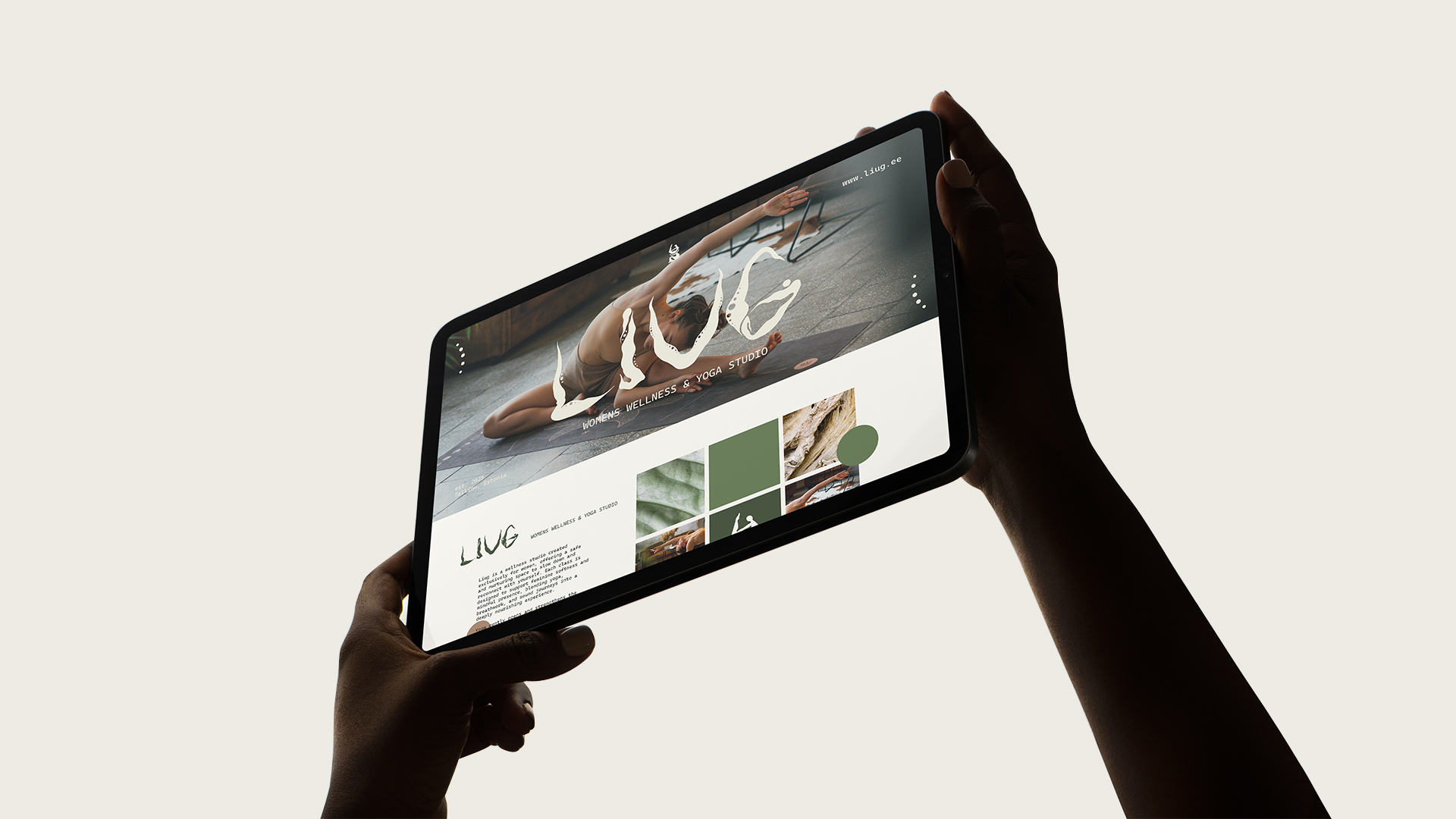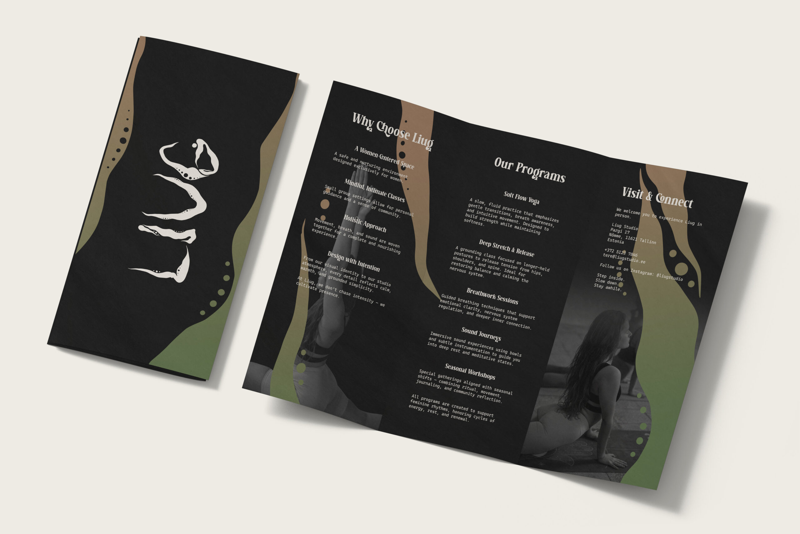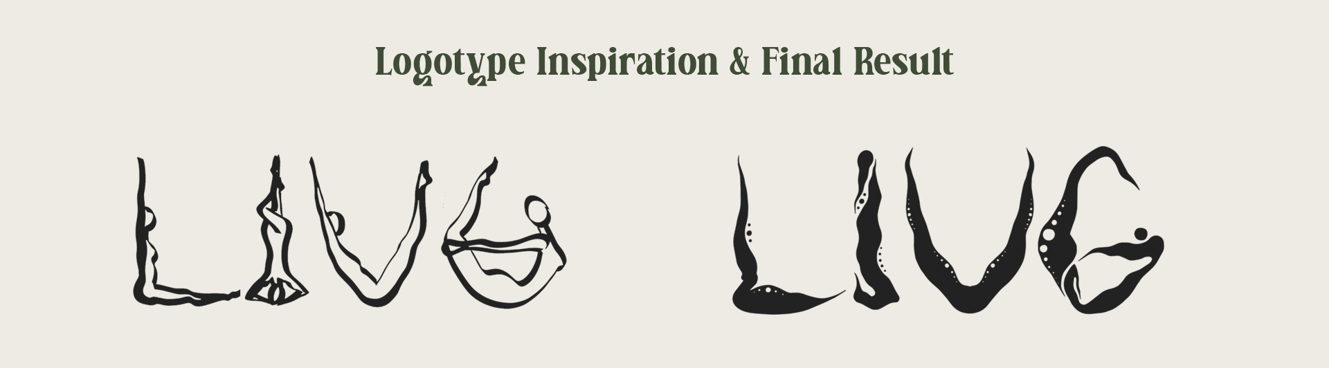 The custom letterforms feel organic and almost liquid, mirroring the meaning of Liug (to glide/flow). The shapes resemble sea plants or gentle waves, reinforcing softness and continuous motion — directly aligned with the studio’s focus on slowing down and moving mindfully.